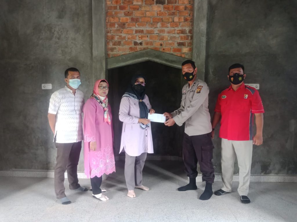 Bantuan dari Aipda Muhammad Aliudin, SH personil Bid Humas Polda Sumsel diterima langsung oleh Sumiyati mewakili panitia Pembangunan Musholah As-Syukur.