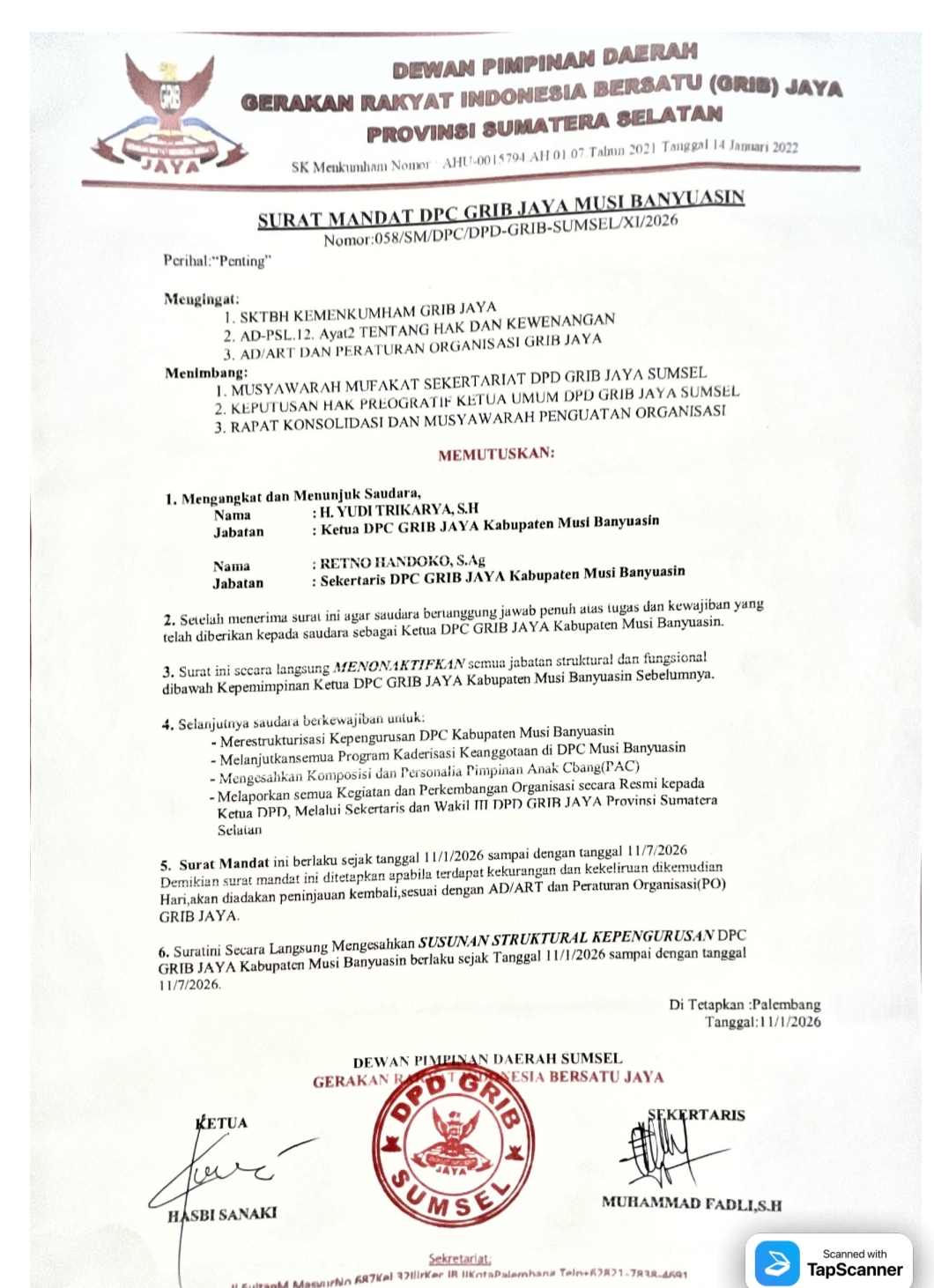 Surat Mandat berlaku 11 Januari hingga 11 Juli 2026 apabila terjadi kekurangan dan kecurangan dikemudian hari maka akan dilakukan peninjauan kembali sesuai AD / RT Organisasi GRIB JAYA.