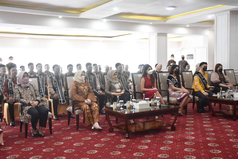 Tiba di Guest House Griya Bumi Serasan Sekate, Kamis (28/10/2021), Putri Indonesia dan rombongan disambut hangat Wakil Ketua I TP PKK Muba Susi Imelda Beni didampingi Ketua DWP Muba Hj Asna Aini Apriyadi serta para finalis Kuyung Kupek Muba 2021 yang kompak menggunakan Gambo Muba.