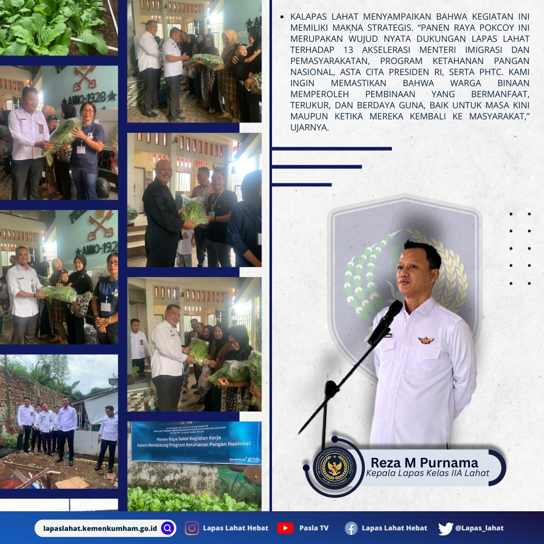 Dalam sambutannya, Kepala Lembaga Pemasyarakatan Kelas IIA Lahat menyampaikan bahwa kegiatan panen raya ini memiliki nilai strategis.“Panen Raya Pakcoy merupakan wujud nyata dukungan Lapas Lahat terhadap 13 Akselerasi Menteri Imigrasi dan Pemasyarakatan, program ketahanan pangan nasional, Asta Cita Presiden Republik Indonesia, serta Program Hasil Terbaik Cepat (PHTC) Presiden Republik Indonesia. Kami berkomitmen memastikan warga binaan memperoleh pembinaan yang bermanfaat, terukur, dan memberikan bekal keterampilan untuk kehidupan setelah bebas,” tegasnya.