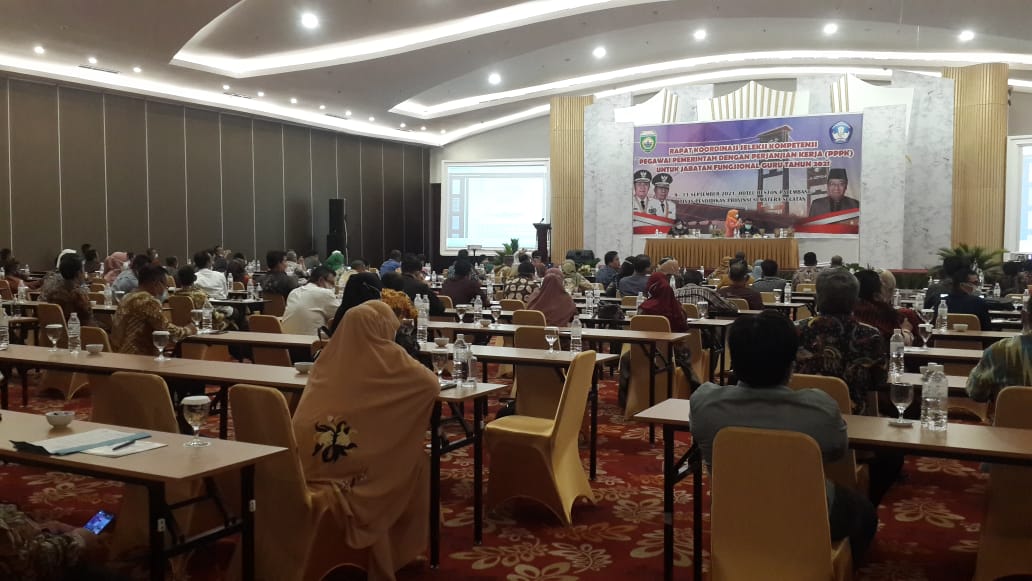 –Dinas Pendidikan Provinsi Sumsel menggelar Rapat koordinasi seleksi kompetensi Pegawai Pemerintah dengan Perjanjian Kerja (PPPK) untuk jabatan fungsional guru tahun 2021 bertempat di Hotel Beston. Rapat koordinasi ini dilaksanakan pada 9-11 September 2021.