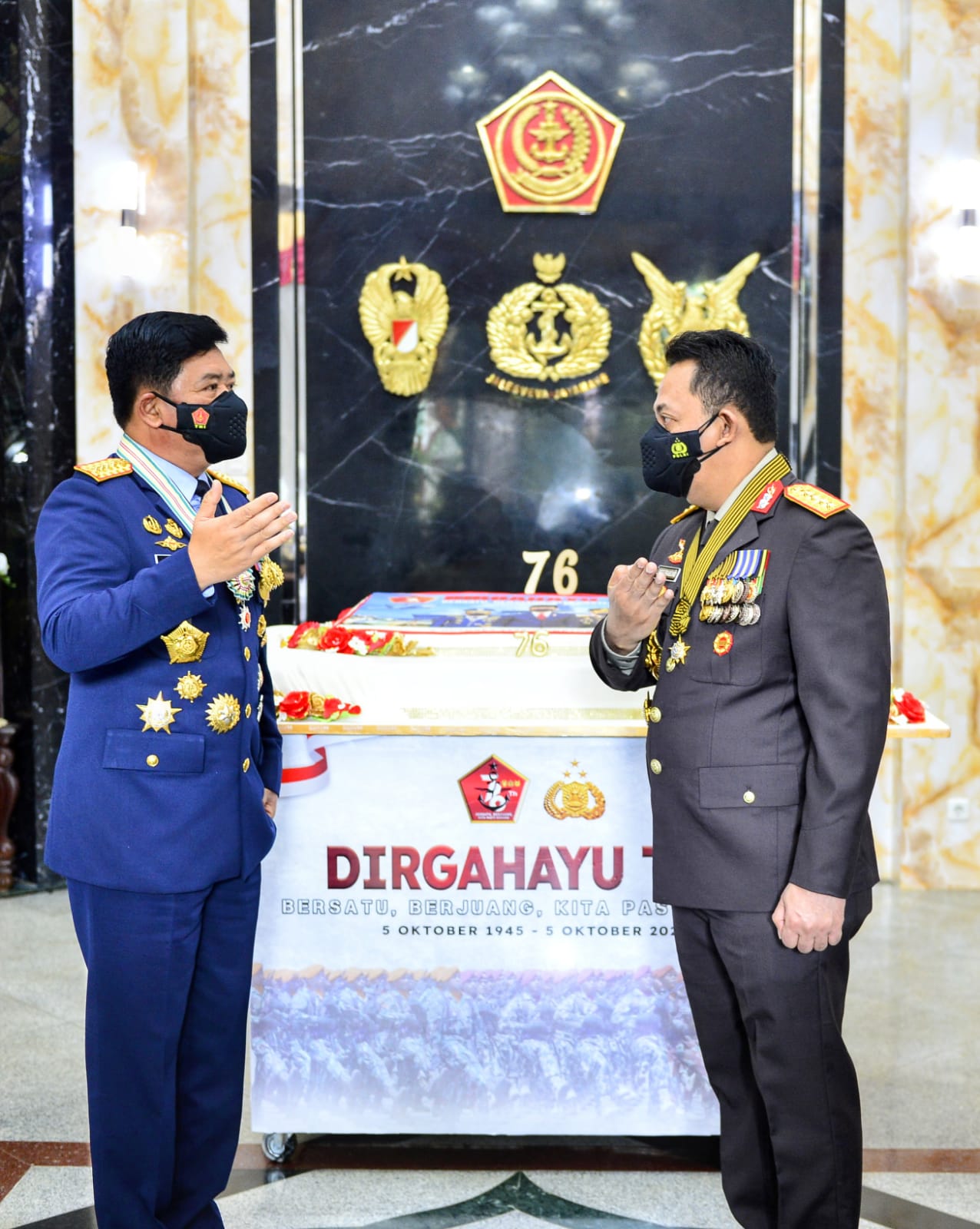 Pada momentum HUT TNI, Kapolri beserta jajaran Mabes Polri juga menyempatkan diri untuk memberikan kejutan dengan membawa kue ulang tahun kepada Panglima TNI Marsekal Hadi Tjahjanto di kantornya Subden Merdeka Barat Denma Mabes TNI, Merdeka Barat, Jakarta Pusat.