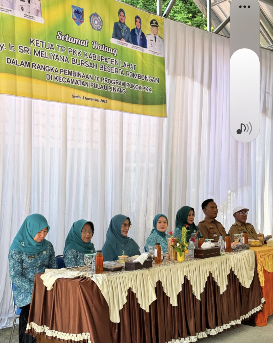 Relasipublik.com | Lahat,-Ketua Tim Penggerak PKK kabupaten Lahat Ir.Sri Meliyana Bursah kembali melaksanakan kegiatan pembinaan 10 program pokok PKK tahun 2025 , bertempat di Kantor Camat Pulau Pinang kabupaten Lahat provinsi Sumsel, Senin (03/11/2025) kedatangan Ir.Sri Meliyana Bursah disambut baik Camat Pulau Pinang Anthoni Hakman, SE., M.M didampingi ketua TP PKK Kecamatan dan kader PKK se Kecamatan Pulau Pinang.