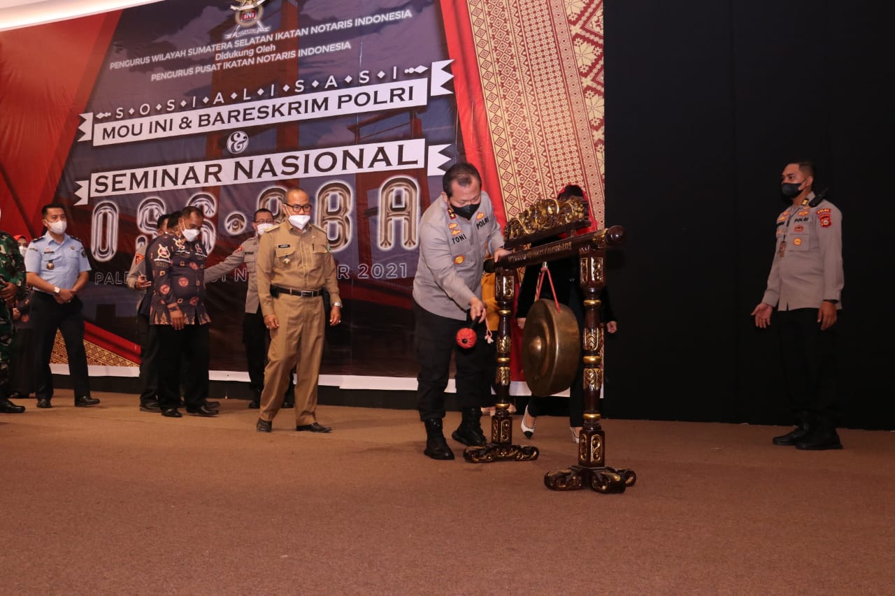 Pembukaan acara Sosialisasi MoU ini dengan Polri dan Seminar Oss RBA ditandai dengan pemukulan Gong oleh Kapolda Sumsel didampingi oleh undangan. Kemudian penandatanganan Pedoman Kerja Antara Ketua Pengurus Wilayah Sumatera Selatan INI dan Kepolisian Daerah Sumatera Selatan berjalan tertib dan sesuai dengan prokes.tutupnya,
