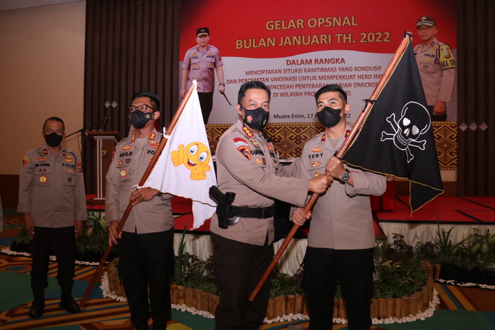 Kemudian terkait pelaksanaan tugas pembinaan dan operasional tugas kepolisian ,Kapolda juga memberikan bendera Putih kepada Polres Muara Enim sedangkan Bendera Hitam diberikan kepada Polres Lahat