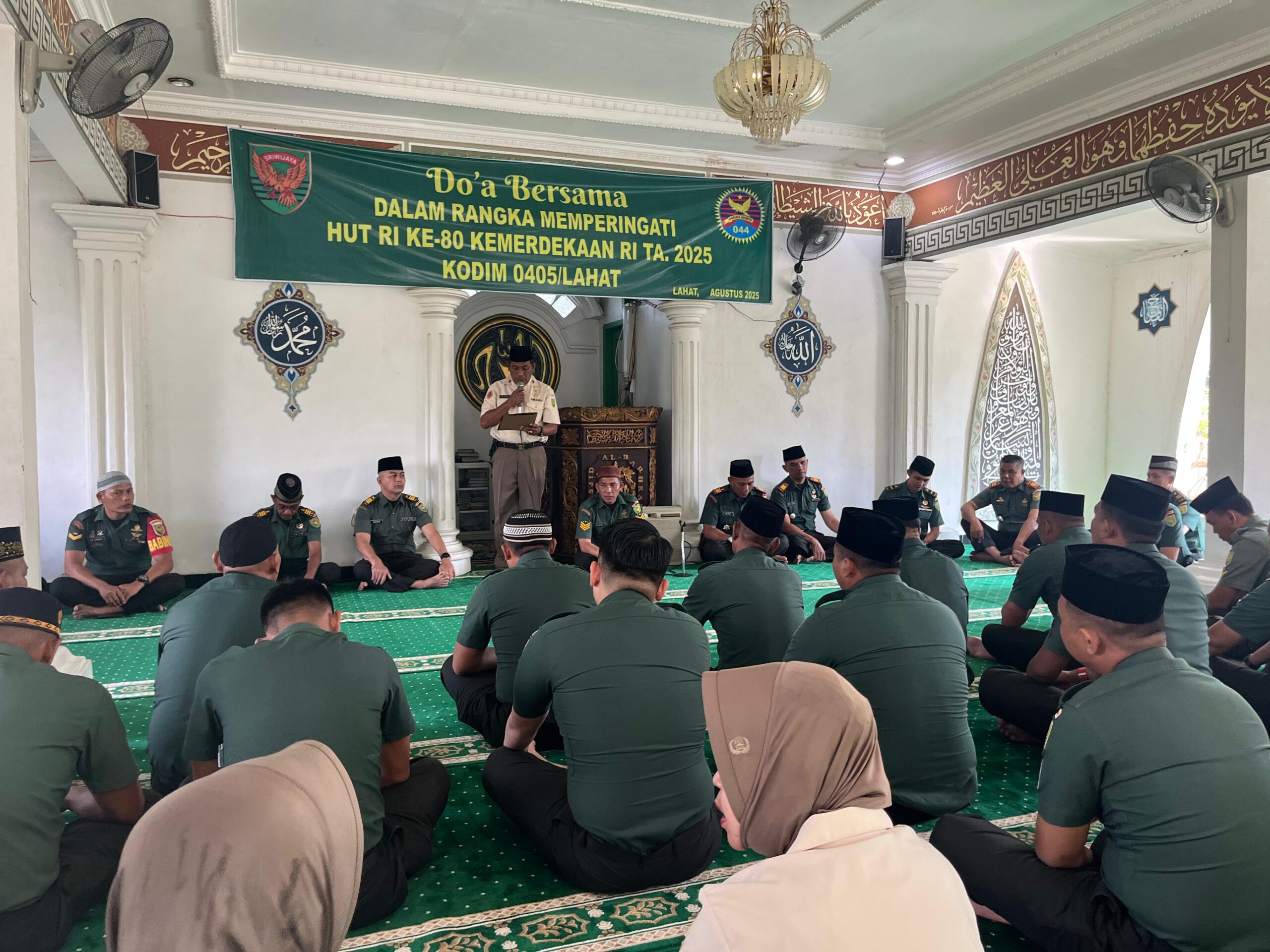 Relasipublik.com | Lahat,-Dalam rangka memperingati HUT RI ke -80 Kodim 0405/Lahat melaksanakan doa bersama di pimpin oleh Sertu Choirl Masjid Al Hanif Kodim 0304/Agam Ust. Raizul Hawari, bertempat di Mushola Makodim 0405/Lahat, Jl. Residen A. Razak Kelurahan Kota Baru Kecamatan Lahat Kabupaten Lahat. Jum’at (15/08/2025).