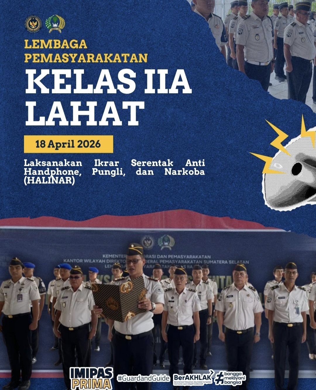 Relasipublik.com | Lahat, — Lembaga Pemasyarakatan (Lapas) Kelas IIA Lahat menggelar kegiatan Ikrar Serentak Anti Handphone, Pungutan Liar, dan Narkoba (HALINAR) secara mandiri pada Sabtu (18/04) sebagai bentuk penegasan komitmen dalam menciptakan lingkungan pemasyarakatan yang bersih, aman, dan berintegritas.