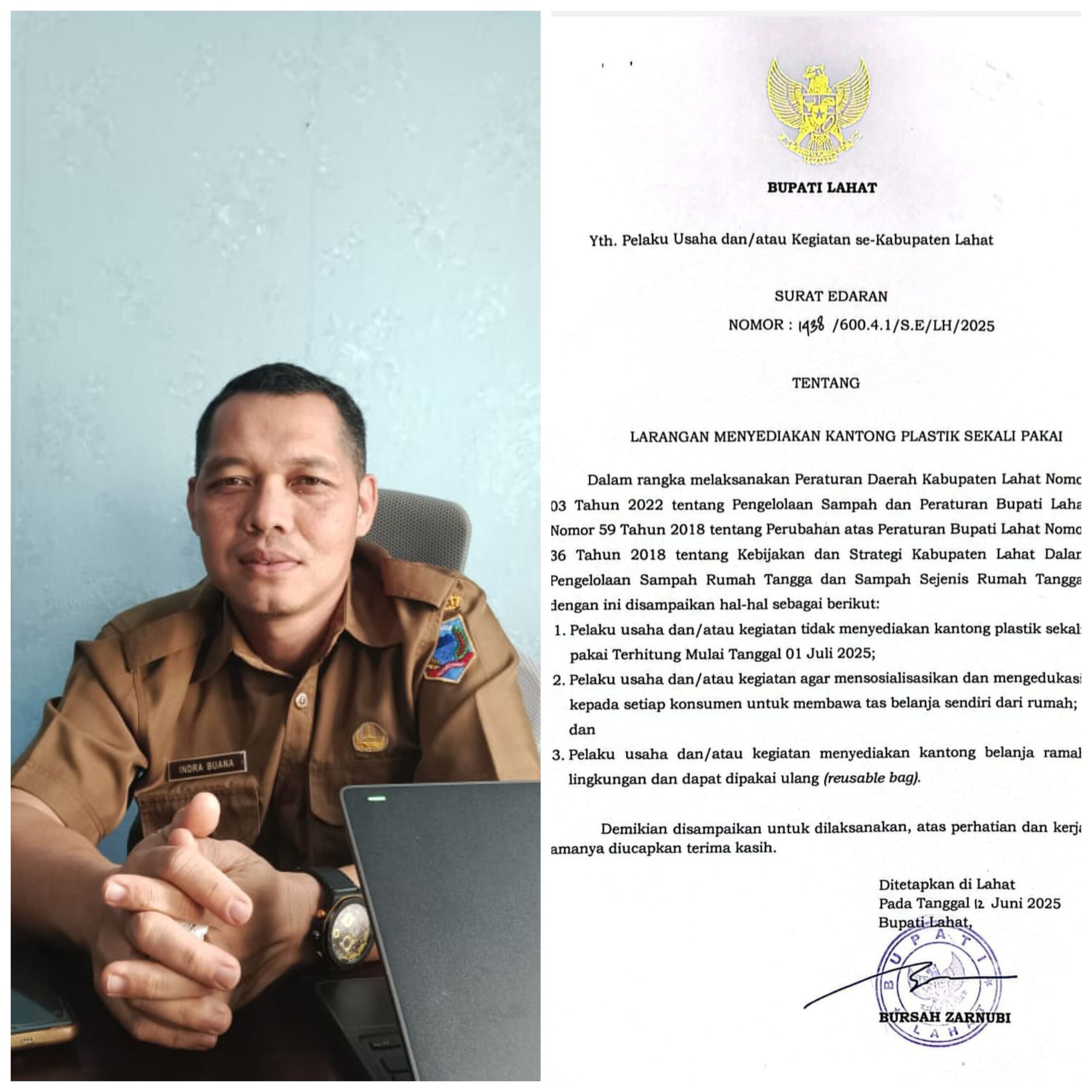 Plt Kepala Dinas Lingkungan Hidup kabupaten Lahat, M Dodi A Nasoha, ST, MSi, melalui Kabid Pengelolaan Sampah dan Limbah B3 DLH Lahat, Indra Buana memgatakan dalam mengurangi masalah sampah plastik, pemerintah Kabupaten Lahat membuat larangan ini. “Pelaku usaha dan/atau kegiatan tidak menyediakan kantong plastik sekali pakai Terhitung Mulai Tanggal O1 Juli 2025, Pelaku usaha dan/atau kegiatan agar mensosialisasikan dan mengedukasi kepada setiap konsumen untuk membawa tas belanja sendiri dari rumah, Pelaku usaha dan/atau kegiatan menyediakan kantong belanja ramah lingkungan dan dapat dipakai ulang (reusable bag)” , ucap Indra Buana. Selasa (22/07/2025)