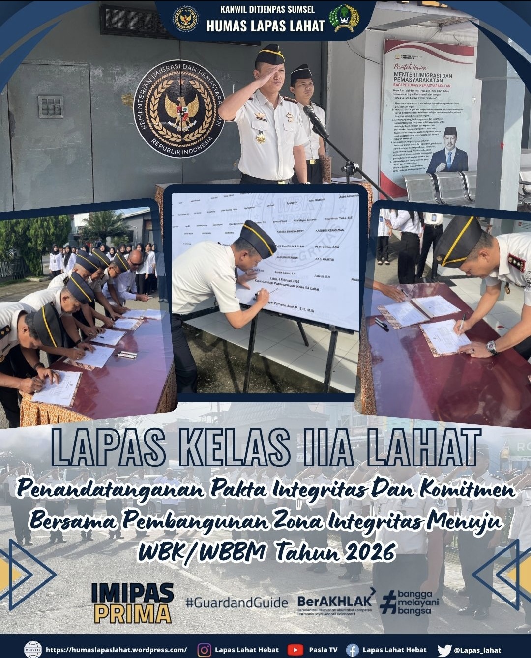 “Penandatanganan Pakta Integritas dan Komitmen Bersama ini merupakan pernyataan sikap, tekad, dan komitmen moral seluruh jajaran Lapas Kelas IIA Lahat untuk mewujudkan pemerintahan yang bersih, transparan, dan akuntabel, serta memberikan pelayanan publik yang profesional dan berintegritas,” tegasnya.