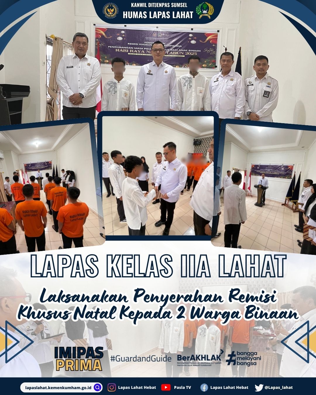 Melalui pelaksanaan pemberian Remisi Khusus Natal Tahun 2025 ini, Lapas Kelas IIA Lahat menegaskan komitmennya untuk terus melaksanakan tugas Pemasyarakatan secara profesional, humanis, dan berintegritas, serta memastikan pemenuhan hak-hak warga binaan berjalan secara adil, transparan, dan sesuai dengan ketentuan peraturan perundang-undangan. (EY)
