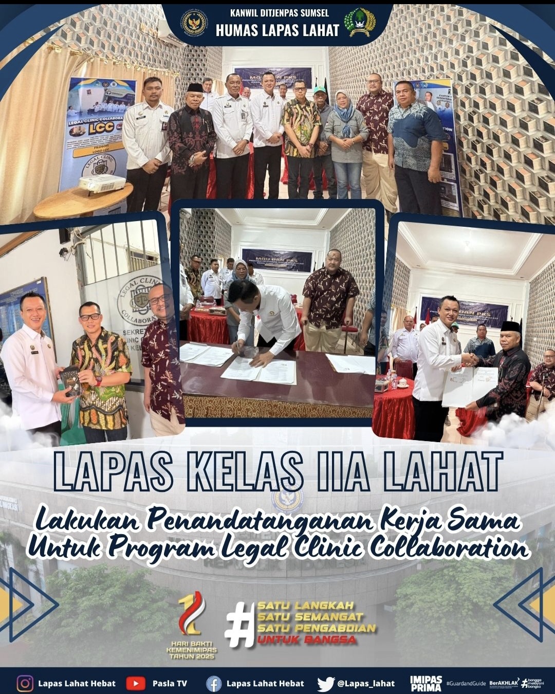 Relasipublik.com | Lahat, — Lapas Kelas IIA Lahat melangkah lebih maju dalam peningkatan akses pelayanan hukum dengan melaksanakan Penandatanganan Memorandum of Understanding (MoU) dan Perjanjian Kerja Sama (PKS) melalui Program Legal Clinic Collaboration (LCC) bersama delapan stakeholder strategis di Kabupaten Lahat.