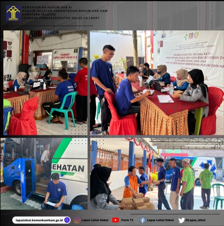 – Lembaga Pemasyarakatan Kelas IIA Lahat Kemenkumham Sumsel melaksanakan Kegiatan Skrining ACF TBC TAHUN 2023 Bagi WBP bekerjasama dengan Kementerian Kesehatan RI, Dinas Kesehatan Kabupaten Lahat, Puskesmas Perumnas Lahat, Global Fund (GF) dan Tirta Medical Center (TMC). Selasa, 10 Oktober 2023.