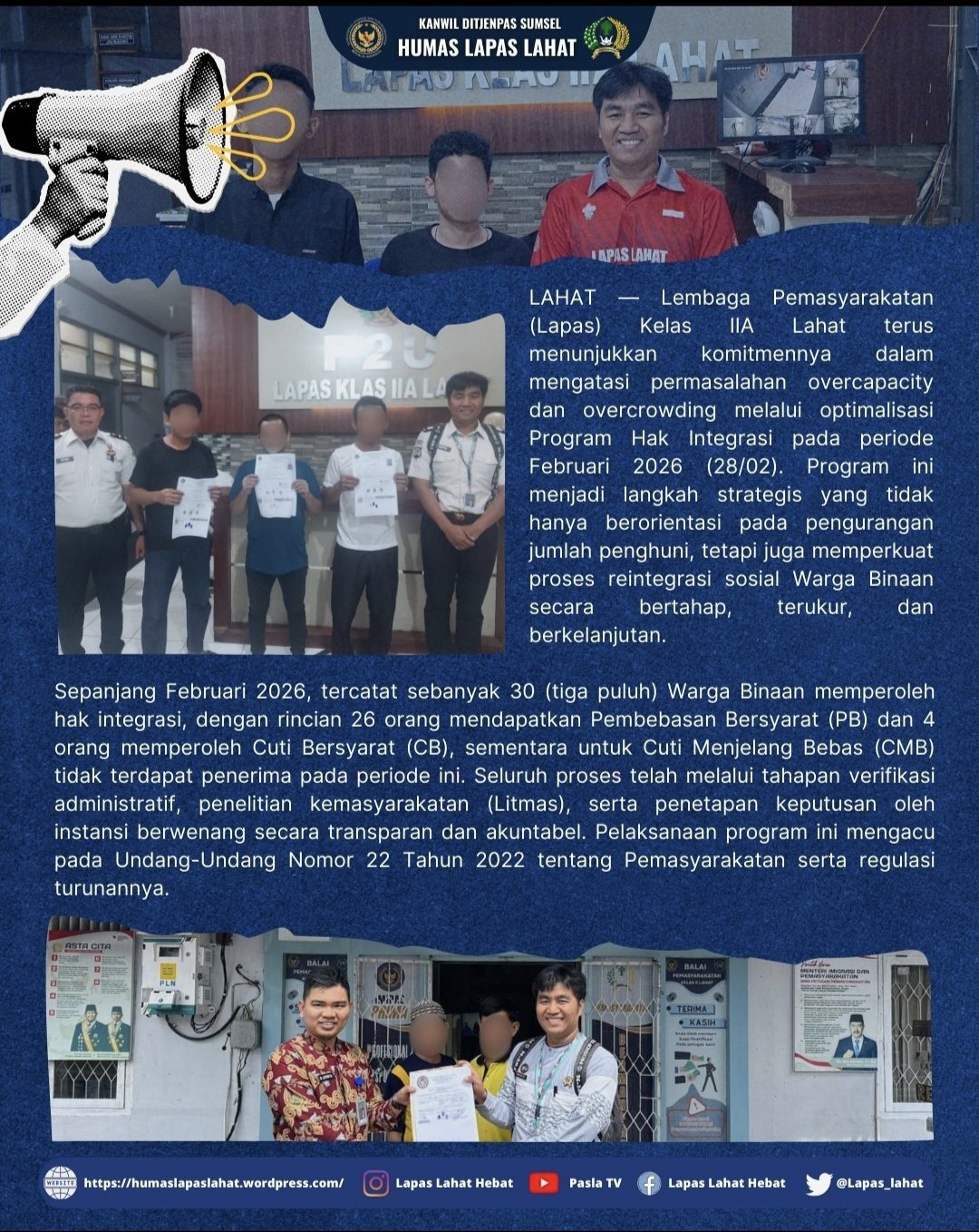 Relasipublik.com | Lahat — Lembaga Pemasyarakatan (Lapas) Kelas IIA Lahat terus menunjukkan komitmennya dalam mengatasi permasalahan overcapacity dan overcrowding melalui optimalisasi Program Hak Integrasi pada periode Februari 2026 (28/02).