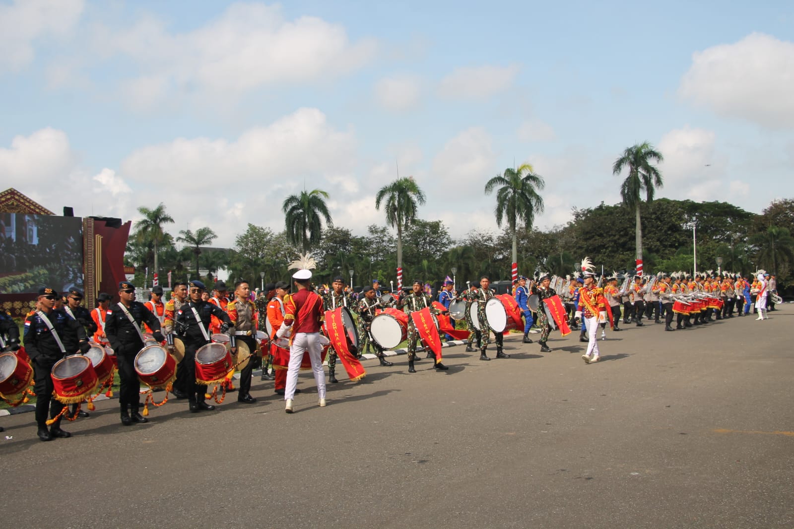 — Marching Band Athidira Wirabhakti Polda Sumatera Selatan tampil memukau dalam peringatan Hari Bhayangkara ke 76 yang di Halaman Griya Agung Palembang, Selasa (5/7/22).