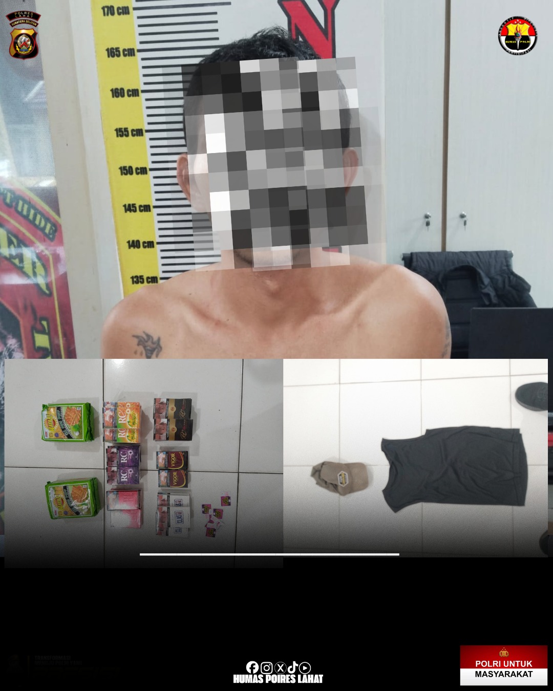 Kapolres Lahat, AKBP Novi Edyanto SIK.MIK melalui humas Polres Lahat Aiptu Lispono SH menyampaikan Kronologis kejadiannya pada hari Senin tanggal 2 Februari 2026 sekira pukul 02.00 WIB bertempat di warung korban yang beralamat di Jalan Gotong Royong RT /RW 018/ 006 Kelurahan Pasar Lama Kecamatan Lahat Kabupaten Lahat telah terjadi tindak pidana pencurian dengan pemberatan terhadap barang milik pelapor berupa satu unit CCTV merek Xiaomi, berbagai macam rokok, roti hitari 2 bungkus dan uang tunai Rp500.000 yang dilakukan oleh terlapor dan melakukan pencurian dengan pemberatan tersebut dengan cara terlapor merusak kunci pintu warung tersebut dengan menggunakan alat bantu jenis 1 buah pahat”, ucapnya.