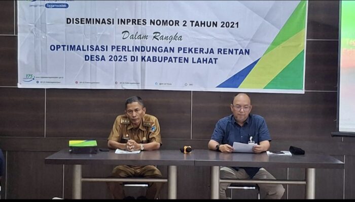 Relasipublik.com | Lahat, – BPJS Ketenagakerjaan Kabupaten Lahat melaksanakan kegiatan diseminasi Inpres nomor 2 tahun 2021 dalam optimalisasi perlindungan pekerja rentan Desa 2025. Selasa (18/03/2025) Tampak di kegiatan Kepala BPJS Ketenagakerjaan Lahat M.Irwan Naser Nawawi, dan jajaran, Plt Kadis PMDes Kabupaten Lahat , perwakilan Camat Lahat dan kades kades dari 3 kecamatan di kabupaten Lahat meliputi Kecamatan Lahat, Kecamatan Lahat Selatan serta Kecamatan Gumay Talang.