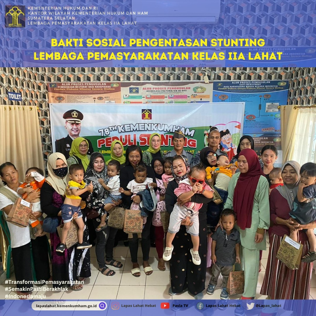 Bakti Sosial Pengentasan stunting sendiri merupakan program pemerintah yang tertuang dalam Peraturan Presiden Nomor 72 Tahun 2021 tentang percepatan Penurunan Stunting. Yang mana pada Lapas Kelas IIA Lahat dilakukan dengan cara pemberian makanan Tambahan bagi Balita berupa paket Susu bubuk yang di salurkan kepada Balita yang berada pada Ruangan Layanan kunjungan WBP.