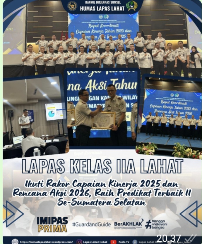 Dalam pelaksanaan rakor tersebut, Lapas Kelas IIA Lahat berhasil meraih predikat Terbaik II Capaian Kinerja Tahun 2025 dan Rencana Aksi Tahun 2026 di lingkungan Kanwil Ditjenpas Sumatera Selatan. Capaian ini menjadi bentuk apresiasi atas komitmen dan kinerja seluruh jajaran Lapas Kelas IIA Lahat dalam melaksanakan tugas pemasyarakatan secara profesional, akuntabel, dan berorientasi pada pelayanan publik.