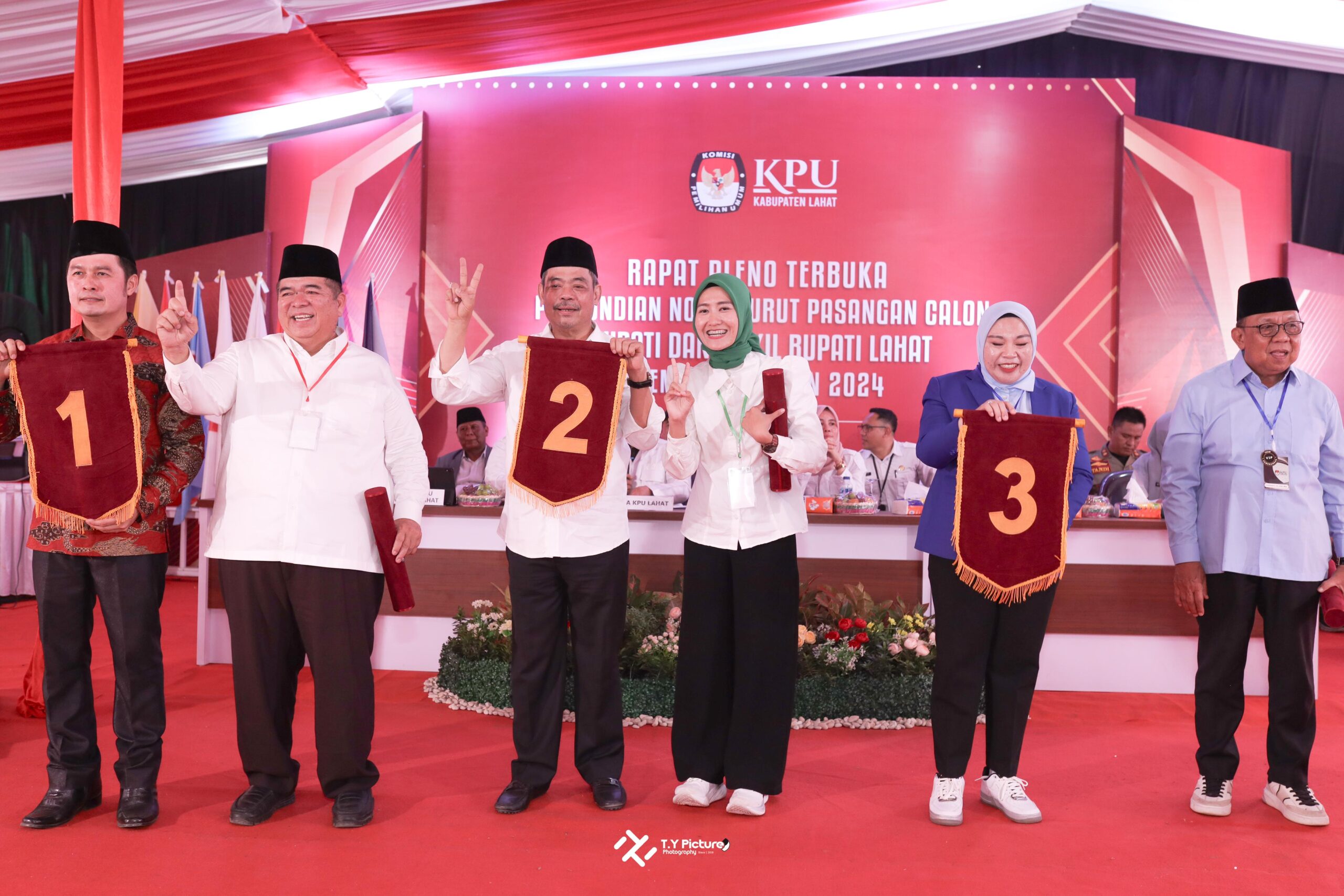 Akhirnya setelah pengundian pasangan calon bupati Lahat dan wakil bupati Lahat yaitu Nomor urut 1 (satu) pasangan calon Yulius Maulana ST dan Dr. H.Budiarto SE MSi, nomor urut 2 (dua) pasangan calon Bursah Zarnubi dan Widia Ningsih SH.MH serta nomor urut 3 (tiga) pasangan calon Lidyawati S.Hut MM dan Haryanto SE .MM .