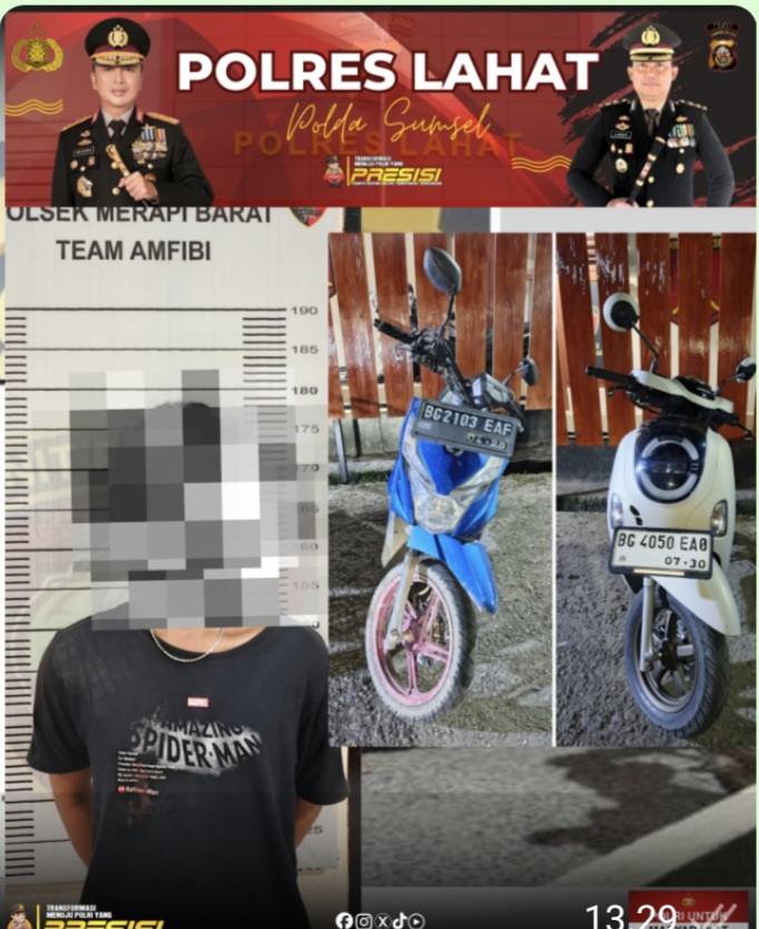 Dari hasil pemeriksaan sementara, pelaku berjumlah 1(satu) orang atas nama DRS bin S, umur 24 tahun, alamat jalan Kerangga lorong langgar kelurahan tiga puluh ilir kec.Ilir Barat dua, kota Palembang.Berita viral diunggah ke media sosial oleh masyarakat hingga akhirnya viral. Saat ini pelaku dan barang bukti diamankan di Polsek Merapi Barat beserta barang bukti 1(satu) unit sepeda motor Honda Scoopy.