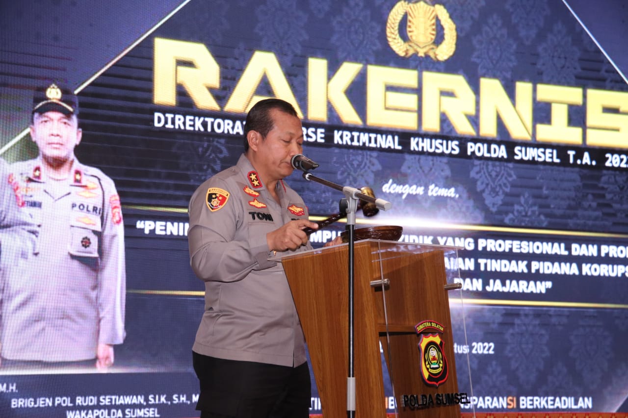 – Kapolda Sumsel, Irjen Pol Drs Toni Harmanto MH tutup langsung Rakernis fungsi Reserse Kriminal Khusus 2022 di lantai 7 gedung utama Presisi Mapolda Sumsel, Jumat (5/8).