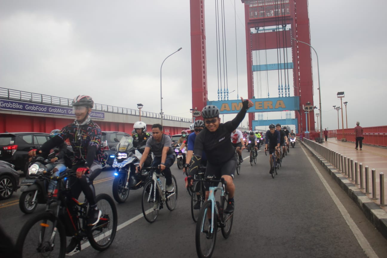 Para petinggi Polri tersebut sambil mengayuh sepeda bersama sembari menikmati kesegaran udara pagi dan keindahan kota Palembang serta menyempatkan diri berswa foto di jembatan Ampera kebanggaan Wong Palembang .
