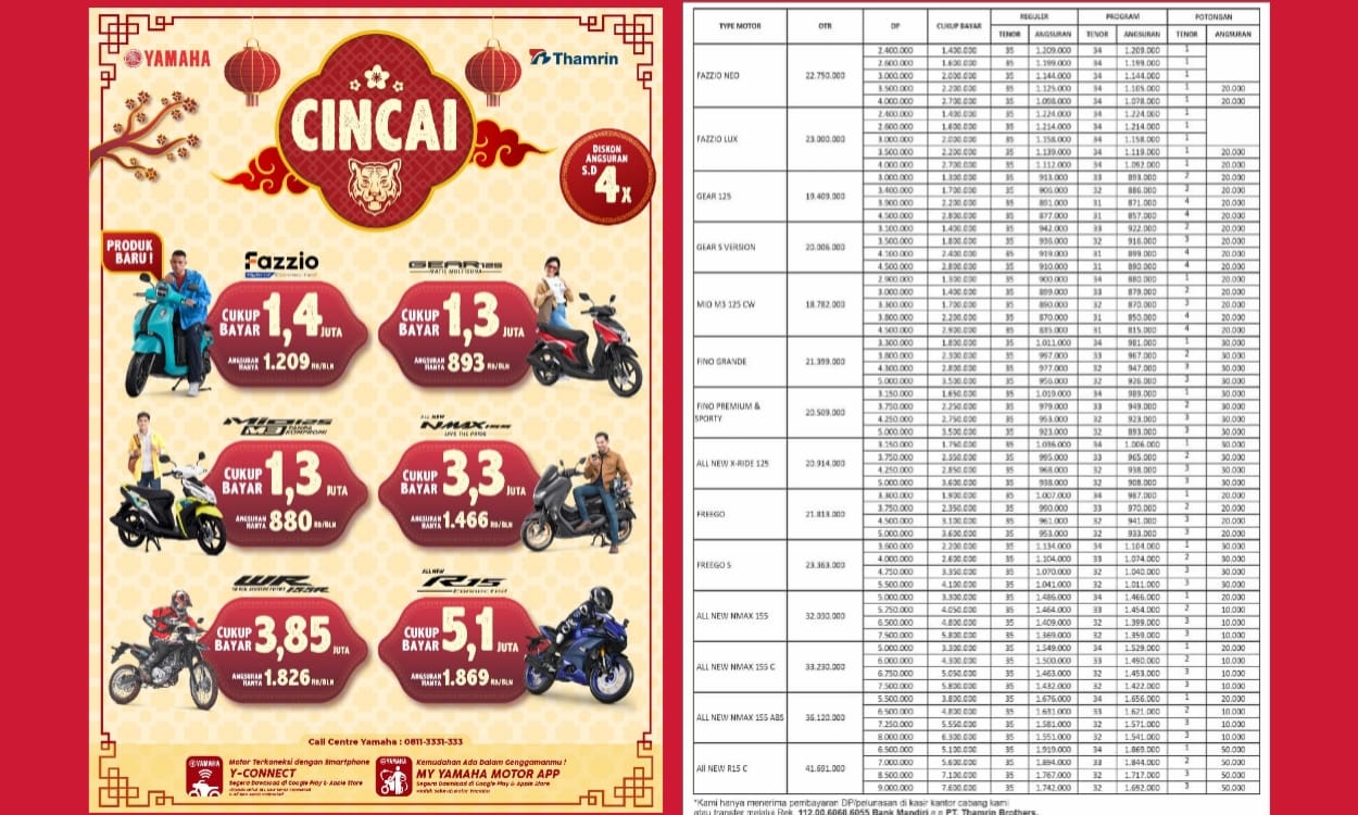 –Dealer Yamaha, PT Thamrin Bersaudara cabang Lahat  di awal  bulan Februari tahun 2022 menggelar promo dengan  tema CINCAI harga dan angsuran terjangkau,promo tersebut untuk memanjakan pelanggan setia Yamaha khususnya di kabupaten Lahat.